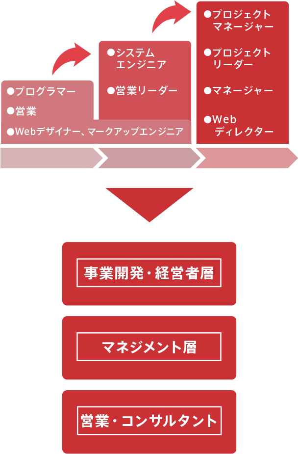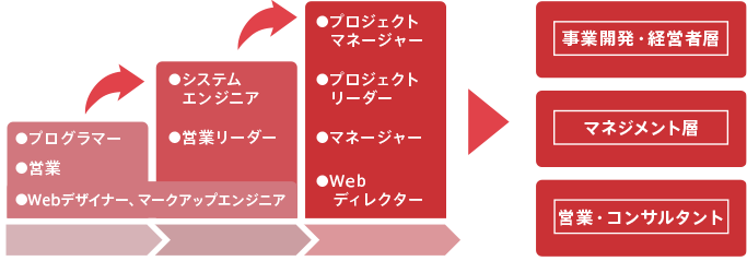 採用・教育においても専任会社を設け、グループ全体の発展のためのサポート体制を整えています。入社前研修(新卒採用者のみ)と入社後の研修(3か月)によって、実際の業務の中で役立つ実践的かつ基礎的なテクニカルスキルを習得でき、ITの未経験者でもプロジェクトの一員として活躍できるようになります。入社後 は「リーダー研修」「マネージャー研修」など、組織人として高いレベルのスキルを高められる研修を行います。